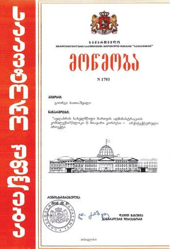 Keywords: Mocmoba.png en Certificate of authorship Author Giga Batiashili Work Presidential Palace in Avlabari Issued by http //www sakpatenti org ge/index php lang_id GEO sec_id 16 lang_id ENG SakPatenti 16 February 2006 ka საავტ რ უფლების მ წმ ბა ავტ რი გიგა ბათიაშვილი აწარმ ები ავლაბრის სახელმწიფ მართვის ადმი ისტრაციის კ მპლექსი ბლ კი 1 მთავარი კ რპუსი - არქიტექტურული პრ ექტი გაცემულია http //www sakpatenti org ge/ საქპატე ტის მიერ 16 თებერვალი 2006 http //geworld net/politics/261 html http //www sakpatenti org ge/index php lang_id GEO sec_id 16 lang_id ENG SakPatenti 2006-02-16 PD-GE-exempt Presidential Palace in Tbilisi |