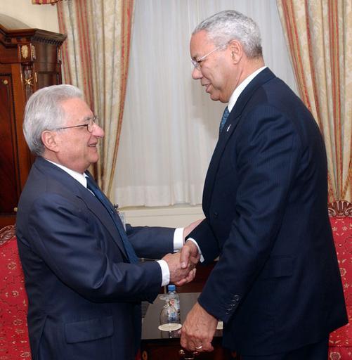 Keywords: Molyriatis-Powell.jpg en Bureau of Public Affairs 59th United Nations General Assembly New York City September 22 2004 Secretary of State Colin Powell with Greek Foreign Minister Petros Molyviatis both attending the 59th UN General Assembly in New York State Department photo by Michael Gross http //www state gov/secretary/former/powell/photos/36469 htm State Department photo by Michael Gross 2004-09-22 PD-USGov Images by Alaniaris/PD uploads Colin Powell Petros Molyviatis Relations of Greece and the United States Handshakes involving politicians |