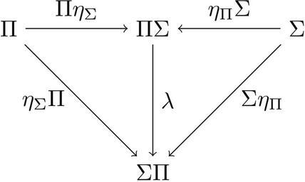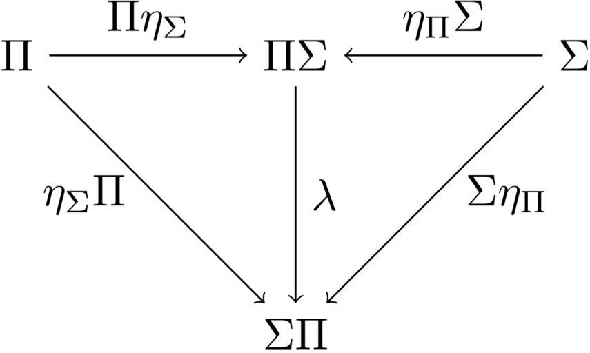 Keywords: MonadDistrEta.svg en Eta part of conditions for a distributive law for two monads <source lang latex > \documentclass10pt article \usepackage tikz \usetikzlibrary shapes arrows \begin document \pagestyle empty \begin tikzpicture scale 2 2 \node PS at 1 1 \Pi\Sigma ; \node P at 0 1 \Pi ; \node S at 2 1 \Sigma ; \node SP at 1 0 \Sigma\Pi ; \draw-> S -- nodeabove \eta_\Pi\Sigma PS ; \draw-> P -- nodeabove \Pi\eta_\Sigma PS ; \draw-> P -- nodeleft \eta_\Sigma\Pi\ SP ; \draw-> S -- noderight \ \Sigma\eta_\Pi SP ; \draw-> PS -- noderight \lambda SP ; \end tikzpicture \end document </source> 2014-01-23 20 43 35 own Daniel5Ko cc-zero Uploaded with UploadWizard Commutative diagrams |