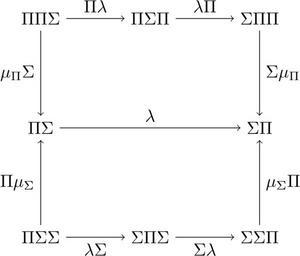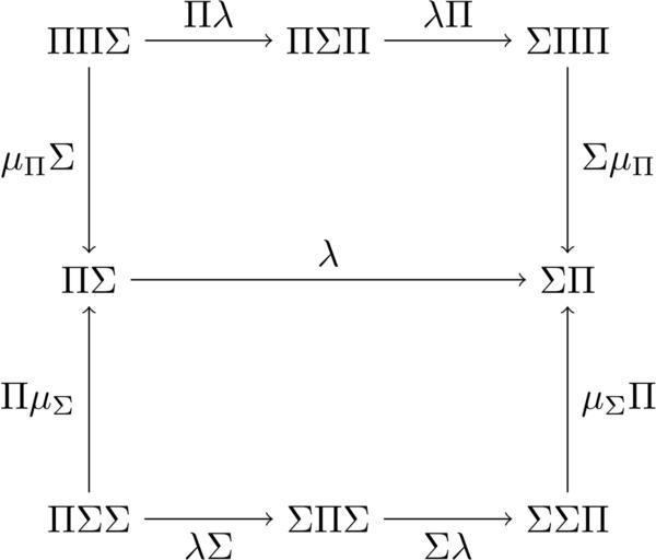 Keywords: MonadDistrMu.svg en Mu part of conditions for a distributive law for two monads <source lang latex > \documentclass10pt article \usepackage tikz \usetikzlibrary shapes arrows \begin document \pagestyle empty \begin tikzpicture scale 2 2 \node PPS at 0 2 \Pi\Pi\Sigma ; \node PSP at 1 2 \Pi\Sigma\Pi ; \node SPP at 2 2 \Sigma\Pi\Pi ; \node PS at 0 1 \Pi\Sigma ; \node SP at 2 1 \Sigma\Pi ; \node PSS at 0 0 \Pi\Sigma\Sigma ; \node SPS at 1 0 \Sigma\Pi\Sigma ; \node SSP at 2 0 \Sigma\Sigma\Pi ; \draw-> PS -- nodeabove \lambda SP ; \draw-> PPS -- nodeabove \Pi\lambda PSP ; \draw-> PSP -- nodeabove \lambda\Pi SPP ; \draw-> PSS -- nodebelow \lambda\Sigma SPS ; \draw-> SPS -- nodebelow \Sigma\lambda SSP ; \draw-> PPS -- nodeleft \mu_\Pi\Sigma PS ; \draw-> SPP -- noderight \Sigma\mu_\Pi SP ; \draw-> PSS -- nodeleft \Pi\mu_\Sigma PS ; \draw-> SSP -- noderight \mu_\Sigma\Pi SP ; \end tikzpicture \end document </source> 2014-01-23 20 39 02 own Daniel5Ko cc-zero Uploaded with UploadWizard Commutative diagrams |