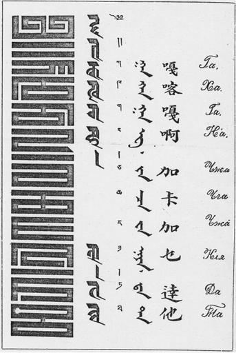 Keywords: Mongolian tibetan scripts primer.jpg Tibetan Primer of the Phags-pa and Lantsa Scripts display Phags-pa with Lantsa Tibetan traditional Mongolian Han Chinese and Cyrillic obtained by a Buriat Cossack officer Tsokto Garmeyevich Badmazhapov in 1903<ref name babelstone >http //www babelstone co uk/Blog/2006/12/phags-pa-fonts-2-babelstone-phags-pa html</ref> de l'écriture phags-pa avec ses équivalents en ranjana ou lanydza tibétain mongol bitchig chinois han et cursive cyrillique obtenu par un officier cosaque bouriate Tsokto Garmeyevich Badmazhapov en 1903<ref name babelstone /> http //www babelstone co uk/Phags-pa/Overview html scanned from Poppe Nicholas The Mongolian Monuments in ḤP'AGS-PA Script Translated and edited by John R Krueger Wiesbaden Otto Harrassowitz 1957 ~ 1903 author PD-old-100 Phagspa script Ranjana script Tibetan writing Mongolian writing Chinese_characters Cyrillic writing |