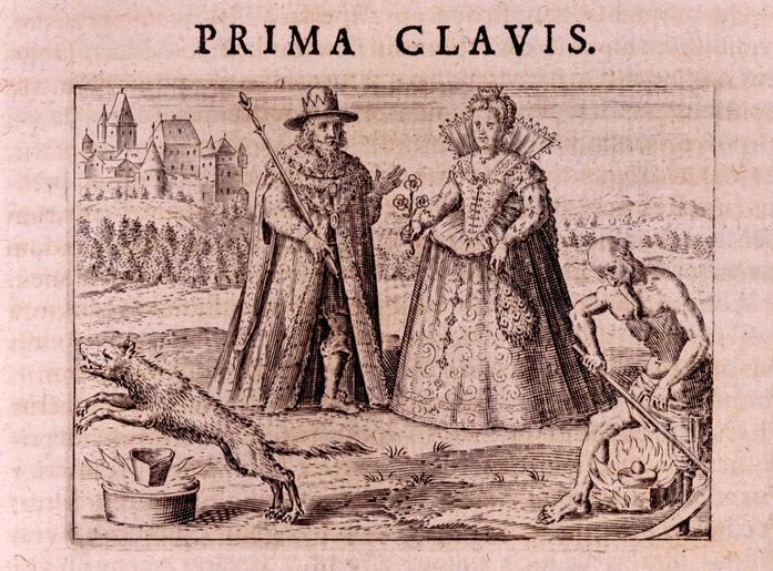 Keywords: Musaeum Hermeticum 1678 I. Clavis AQ30 Key 1.tif Matthaeus Merian 1593 “1650 From Tripus aureus hoc est Tres tractatus chymici selectissimi nempe I Basilii Valentini benedictini ordinis monachi Germani practica una cum 12 clavibus et appendice ex germanico; II Thomae Nortoni angli philosophi crede mihi seu ordinale ante annos 140 ab authore seriptum nunc ex anglicano manuscripto in latinum translatum phrasi eujusque authoris ut et sententia retenta; III Cremeri cuiusdam abbatis westmonasteriensis angli testamentum hactenus nondum publicatum nunc in diversarum nationum gratiam editi et figuris cupro affabre incisis ornati operâ et studio Michaelis Maieri phil et med d com p c Francofurti apud Hermannum à Sande MDCLXXVII as published in the collection Musaeum hermeticum reformatum et amplificatum Francofurti Apud Hermannum à Sande 1678 In Latin The part in question 'I Basilii Valentini benedictini ordinis monachi Germani practica una cum 12 clavibus et appendice ex germanico;' or 'Basil Valentine a German monk of the Benedictine order one study with the twelve keys and the appendix translated from the German ' A finely dressed King stands on the left and Queen on the right in a landscape with a city or castle in the background left The king holds a sceptre in his right hand the Queen holds a three blossomed flower in her right and a peacock feather fan in her left In front of the King a wolf or dog jumps over a crucible placed on a basin of fire In front of the Queen an old man with a scythe and crippled leg steps across a fire on which a vessel is being heated http //othmerlib chemheritage org/record b1035996~S6 Catalog Information From the copy in the Roy G Neville Historical Chemical Library http //www chemheritage org/ Chemical Heritage Foundation Downloaded with permission from the Chemical Heritage Foundation as part of the Wikipedian in Residence initiative Chemical Heritage Foundation http //www chemheritage org/ Chemical Heritage Foundation 1678 PD-old-100 PD-old-100 cc-by-3 0 Chemical Heritage Foundation Musaeum Hermeticum Archives Images from the Chemical Heritage Foundation Twelve Keys of Basil Valentine |