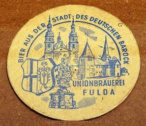 Keywords: Musée Européen de la Bière, Beer coaster pic-164.JPG Unionbrauerei Fulda Photographed through glass own 2012-08-16 16 51 07 AlfvanBeem CC-zero Trademarked Musée Européen de la Bière Nostalgia by Alf van Beem Beermats