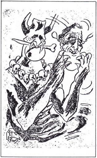 Keywords: Naming the western barbarians.jpg en Drawing of an ogre with a necklace of skulls removing a Roosevelt-faced mask 1944-10 Manga 漫画 Yoshikuni Saso Custom license marker 2013 06 26 PD-Japan-oldphoto Uploaded with UploadWizard World War II posters from Japan Propaganda of Japan |
