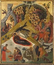 Keywords: Nativity (Cretan school, 15th c.).jpg Γέννηση του Χριστού δεύτερο μισό του 15ου αιώνα 78x96εκ άγνωστος μεταβυζαντινός ζωγράφος α ό την Κρήτη Στο κέντρο της σύνθεσης εικονίζεται η Παναγία ξα λωμένη έξω α ό το σ ήλαιο της Γέννησης ο μικρός χριστός στη φάτνη και τα ζώα ου τον ζεσταίνουν με τις ανάσες τους Γύρω α ό το κεντρικό θέμα εικονίζονται τα δευτερεύοντα ε εισόδια της αφήγησης του ευαγγελίου και των α οκρύφων ευαγγελίων ό ως το Λουτρό του Βρέφους η συνομιλία του Ιωσήφ με τους βοσκούς η άφιξη των άγων η αναγγελία στους οιμένες και η δοξολογία των αγγέλων Ο λαγός και το ελάφι στο ρώτο ε ί εδο είναι στοιχεία α ό την τέχνη της Αναγέννησης http //eib xanthi ilsp gr/gr/icons asp second half of the 15th century unknown post-Byzantine painter from Crete Files uploaded by Shakko from various sources PD-old Cretan School Icons of the nativity of Jesus Christ 15th-century icons of Byzantine Empire |