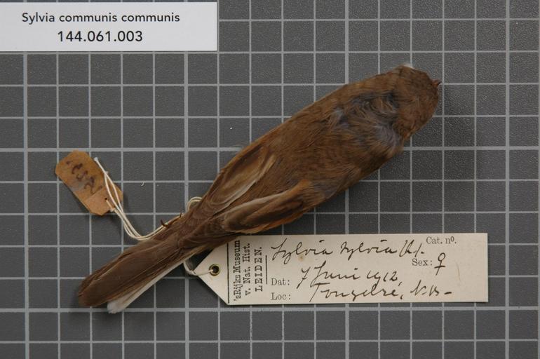 Keywords: Naturalis Biodiversity Center - RMNH.AVES.2523 1 - Sylvia communis communis Latham, 1787 - Sylviidae - bird skin specimen.jpeg artwork Dimensions artwork Document type Sylviidae Sylvia Individual count 1 Infraspecific epithet communis Infraspecific rank Institution Naturalis Kind of unit artwork Kind of unit specimen skin Life stage N B Tongelre Medium artwork Nomenclatural code Occurrence ID page Other fields Other versions artwork Permission license Naturalis donation CC-0 Publication location Scientific name Sylvia communis communis Latham 1787 Scientific name authorship Latham 1787 female Source url http //bioportal naturalis nl Specific epithet communis State or province N B Subject keywords artwork Subject keywords publication Title artwork Title publication Type status Uploaded with GWToolset Naturalis_Biodiversity_Center_-_RMNH AVES 2523_1_-_Sylvia_communis_communis_Latham _1787_-_Sylviidae_-_bird_skin_specimen http //medialib naturalis nl/file/id/RMNH AVES 2523_1/format/large Media donated by Naturalis Biodiversity Center Songbird specimens at Naturalis Biodiversity Center Sylvia communis Sylvia |