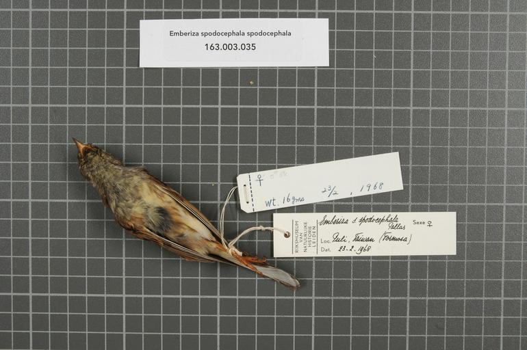 Keywords: Naturalis Biodiversity Center - RMNH.AVES.53366 2 - Emberiza spodocephala spodocephala Pallas, 1776 - Emberizidae - bird skin specimen.jpeg artwork Dimensions artwork Document type Emberizidae Emberiza Individual count 1 Infraspecific epithet spodocephala Infraspecific rank Institution Naturalis Kind of unit artwork Kind of unit specimen skin Life stage Taiwan Formosa Puli Medium artwork Nomenclatural code Sex remark on label female whipped out male GK Occurrence ID page Other fields Other versions artwork Permission license Naturalis donation CC-0 Publication location Scientific name Emberiza spodocephala spodocephala Pallas 1776 Scientific name authorship Pallas 1776 female Source url http //bioportal naturalis nl Specific epithet spodocephala State or province Subject keywords artwork Subject keywords publication Title artwork Title publication Type status Uploaded with GWToolset Naturalis_Biodiversity_Center_-_RMNH AVES 53366_2_-_Emberiza_spodocephala_spodocephala_Pallas _1776_-_Emberizidae_-_bird_skin_specimen http //medialib naturalis nl/file/id/RMNH AVES 53366_2/format/large Media donated by Naturalis Biodiversity Center Songbird specimens at Naturalis Biodiversity Center Emberiza spodocephala Emberiza |