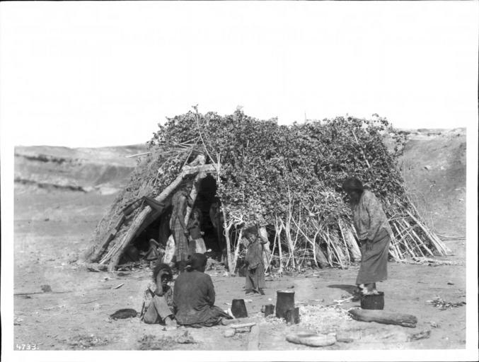 Keywords: Navajo family at their hogan in Blue Canyon, ca.1900 (CHS-4733).jpg en <br> Navajo family at their hogan in Blue Canyon ca 1900 Photograph of Navajo family at their hogan in Blue Canyon ca 1900 The hogan which is constructed from tented rough-hewn timbers covered with leafy branches stands near the campfire around which various cooking instruments sit A man two women and three children are visible One of the women can be seen sitting near the campfire with a child to her left shading his eyes Another woman can be seen at right with a child to her left raising his left arm The man can be seen near the doorway of the hogan standing near a small girl The man wears a headband and has his hair pulled upwards He does not wear a shirt but rather has it draped over his shoulder Mountain ridges can be seen in the extreme background Call number CHS-4733 Photographer James George Wharton Filename CHS-4733 Coverage date circa 1892 Part of collection California Historical Society Collection 1860-1960 Type images Part of subcollection Title Insurance and Trust and C C Pierce Photography Collection 1860-1960 Repository name USC Libraries Special Collections Format glass plate negatives Microfiche number 1-174- Archival file chs_Volume98/CHS-4733 tiff Repository address Doheny Memorial Library Los Angeles CA 90089-0189 Geographic subject country USA Format aacr2 2 photographs glass photonegative photoprint b w ; 17 x 22 cm Rights Digitally reproduced by the USC Digital Library; From the California Historical Society Collection at the University of Southern California Subject adlf housing areas Project USC Accession number 4733 Repository email specol usc edu Identifying number unidentified no James-1113 Contributing entity California Historical Society Date created circa 1892 Publisher of the digital version University of Southern California Libraries Format aat photographic prints; photographs Legacy record ID chs-m17044; USC-1-1-1-13946 Access conditions Send requests to address or e-mail given Phone 213 821-2366; fax 213 740-2343 Subject file heading Indians -- Navajo Subject lcsh Indians of North America; Navajo Indians; Dwellings Subject Navajo Indians circa 1892 date created George Wharton James 1858 1923 http //digitallibrary usc edu/cdm/ref/collection/p15799coll65/id/17059 PD-old-70-1923 Images from USC Digital Library uploaded by Fæ Photographs by George Wharton James California Historical Society Collection 1860-1960 Glass plate negatives Historical photographs of Navajo people |