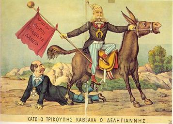 Keywords: Neos Aristofanis5.jpg en Greek satirical poster of 1895 depicting Diligiannis and Trikoupis 1895 The flag reads down with the taxes up with the loans el Γελοιογραφία του ' έου Αριστοφάνη' ου συμβολίζει την τώση του Τρικού η και την νέα ολιτική άνοδο του Δηλιγιάννη με ρόγραμμα λιτότητας και φορολογικής ανακούφησης του λαού Ιστορία του Ελληνικού Έθνους Εκδοτική Αθηνών Αθήνα 1978 ISBN 960-213-110-1 σελ 41 author 1895 δείτε αρακάτω α ό έο Αριστοφάνη PD-old 1895 in Greece Charilaos Trikoupis Theodoros Diligiannis Political cartoons of Greece 1890s political cartoons |