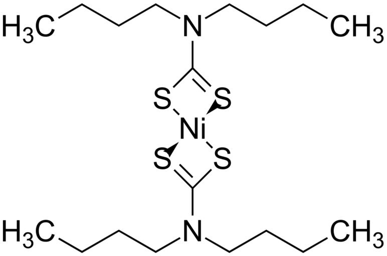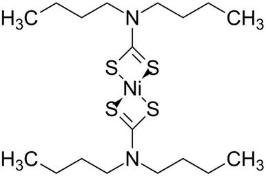 Keywords: Nickel(II) dibutylcarbamodithioate 200.svg validSVG Structure of nickel II dibutylcarbamodithioate Own 2014-04-08 Emeldir <span class signature-talk >talk</span> Chemical structure verified https //upload wikimedia org/wikipedia/commons/e/ef/Nickel 28II 29_dibutylcarbamodithioate_200 svg 1S/2C9H19NS2 Ni/c2 1-3-5-7-10 9 11 12 8-6-4-2;/h2 3-8H2 1-2H3 H 11 12 ;/q;;+2/p-2 HPOWMHUJHHIQGP-UHFFFAOYSA-L 13927-77-0 Synonyms <small> Dibutyldithiocarbamato nickel II Bis dibutyldithiocarbamate nickel complex Bis dibutyldithiocarbamato nickel Carbamic acid dibutyldithio- nickel salt Carbamic acid dibutyldithio- nickel 2+ salt Carbamodithioic acid dibutyl- nickel 2+ salt DI-N-BUTYLDITHIOCARBAMIC ACID NICKEL SALT Di-n-butyldithiocarbamic acid nickel salt Dibutyldithiocarbamic acid nickel salt NBC Nickel bis dibutyldithiocarbamate Nickel di-n-butyldithiocarbamate Nickel dibutyldithiocarbamate Nickel II bis dibutyldithiocarbamate Nickel II dibutyldithiocarbamate Nickel bis dibutylcarbamodithioato-S S' - SP-4-1 - Nickel bis dibutylcarbamodithioato-S S' - SP-4-1 - 9CI Nickel bis dibutyldithiocarbamato - 8CI Rylex NBC Vanguard N WLN 4N4 YUS S 2-NI-</small> PD-chem Nickel complexes Dithiocarbamates |