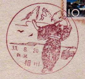 Keywords: Niigata Aikawa 33.8.20.JPG ja 新潟 の佐渡島にある相 郵便 の風景印 own stamp collection Niigata Aikawa Post Office 1958-8-20(昭和三十三年八 二十日) Landscape Postmarks of Japan PD-Japan-organization
