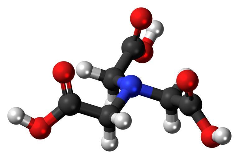 Keywords: Nitrilotriacetic acid molecule ball.png Ball-and-stick model of the nitrilotriacetic acid molecule a chelating agent This image shows the electrically neutral form Color code 505050 Carbon C black<br> F0F0F0 Hydrogen H white<br> F51E1E Oxygen O red<br> 3C50FA Nitrogen N blue<br> 2011-09-21 own DS Visualizer Jynto talk Neutral form space-filling version Zwitterionic form ball-and-stick version Zwitterionic form space-filling version cc-zero Images by Jynto Tricarboxylic acids Tertiary amines Chelating agents |