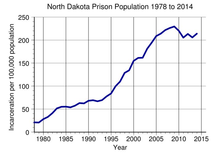 Keywords: North Dakota Prison Population.svg en North Dakota prison incarceration rate per 100 000 population from 1978 to 2014 Data from http //www bjs gov/index cfm ty nps BJS 2016-05-10 own Delphi234 other versions current annually Generated with Wikimedia SVG Chart SVG Chart/box cc-zero Demographics of North Dakota Imprisonment and detention rates in the United States |