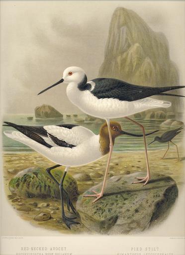 Keywords: NZ Avocet & Piedstilt.jpg Red-necked Avocet Recurvirostra novæ hollandiæ Pied Stilt Himantopus leucocephalus Black Stilt H novæ zealandiæ en Red-necked Avocet Recurvirostra novaehollandiae White-headed Stilt or Pied Stilt Himantopus leucocephalus and Black Stilt/Kakī Himantopus novaezelandiae Buller's A History of the Birds of New Zealand 2nd edition Published 1888 Published 1888 By J G Keulemans PD-old-auto-1923 1912 checked WikiProject Birds A History of the Birds of New Zealand by Buller Plate XXVII Recurvirostra novaehollandiae Himantopus leucocephalus Himantopus novaezelandiae |