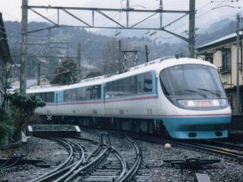 Keywords: OER 20000 Hakone8 Kazamatsuri 19950318.jpg Odakyu Electric Railway EMU Type 20000 Hakone No 8 at Kazamatsuri Sta Photo by Cassiopeia_sweet 1995-03-18 Cassiopeia_sweet PD-self 1995 in rail transport in Japan Odakyu 20000 series RSE Hakone train Hakone Tozan Railway Kazamatsuri Station Dual-gauge rail tracks in Japan Trains on curves |