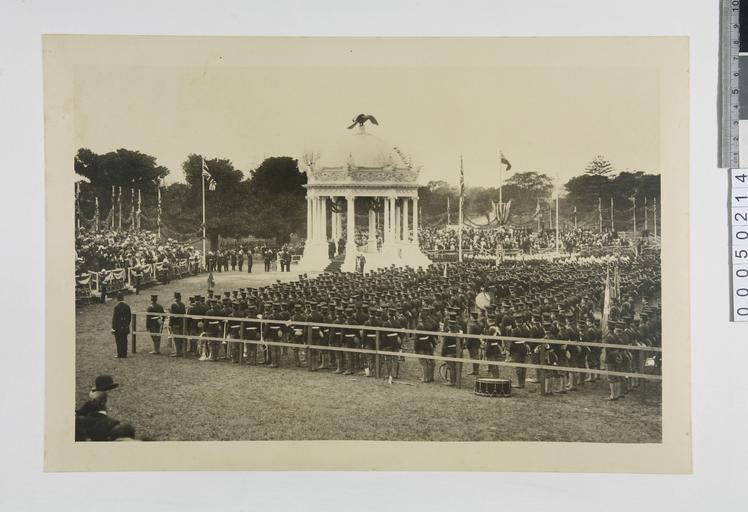 Keywords: unitedstatesnavy usnavy warships sydney greatwhitefleet admiralsperry domain photo border outdoor This photograph depicts the official reception of Admiral Perry, Commander of the United States' Great White Fleet to the Domain, Sydney. It was printed to commemorate this event in 1908 and was one of many souvenirs produced for the occasion. The images in this set document the arrival in Sydney of 16 American warships as they circumnavigated the world during a goodwill voyage from December 1907 February 1908. Object number 00050214 Interested in other items relating to the Great White Fleet? Check out our blog: bit.ly/IEoF7B This photograph depicts the official reception of Admiral Perry, Commander of the United States' Great White Fleet to the Domain, Sydney. It was printed to commemorate this event in 1908 and was one of many souvenirs produced for the occasion. The images in this set document the arrival in Sydney of 16 American warships as they circumnavigated the world during a goodwill voyage from December 1907 February 1908. Object number 00050214 Interested in other items relating to the Great White Fleet? Check out our blog: bit.ly/IEoF7B |