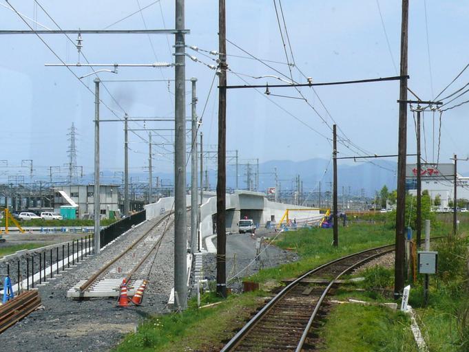 Keywords: Ohmi Railway Main Line New line switch construction.JPG Ohmi Railway Main Line New line switch construction 近江鉄道 線の米原~フジテック前の駅間の線路移設工事 列車車内より撮影 Own 2007-05-12 まも PD-user-w 35 18 4 776306 N 136 17 9 58374 E alt 0_source exif_heading Ohmi Railway Main Line Maibara Shiga Construction sites in Japan Rail track construction |
