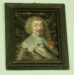 Keywords: Oljemålning på duk, porträtt av Francois de Bonne Crequi, från 1650 - Skoklosters slott - 92378.tif Francois de Bonne Crequi marskalk plain text sv Bröstbild fas höger <br/>Grått lockigt hår med röd rosett mörkt grånat pipskägg <br/>Guldornerat svart harnesk nedliggande vit spetskantad krage och över högra axeln vit bindel med guldspets <br/>Röd bandrosett på vänster kragsnibb <br/>Målad text M LE MARESCHAL DE CRIQVY <br/>Duken spikad direkt på ramen <br/>Svart profilerad fururam bredd 115 mm <br/>På ramen klistrad wrangellapp 215 Marschall de criqui <br/>Under lappen 46 med rödkrita original caption Oljemålning på duk porträtt av Francois de Bonne Crequi från 1650 <br/> Nyckelord Porträtt ca 1650 size mm 520 610 SKO Carl Gustaf Wrangel place of origin original filename sm_dig9515 32257 inventory number SKO 11632 92378 PD Margareta Gaik Portrait paintings Margareta Gaik Media contributed by LSH tag as oil on canvas Media contributed by LSH 2014-11 |