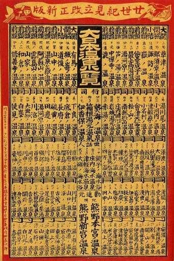 Keywords: Onsen banzuke Meiji Era.png en Onsen Banzuke in Meiji period 1908 ja 明治時代の温泉番付 廿世 見立改正新版 大日 温泉 覧 明治41年(1908年)10 片田長次郎版 http //www kankoukeizai-shinbun co jp/100sen/onsen_banzuke3 html Namazu-tron 1908 PD-Japan Banzuke Japanese calligraphy Hot springs of Japan |