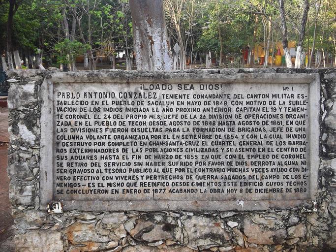 Keywords: Parque Zoológico del Centenario, Mérida, Yucatán (06).jpg 20 970627 -89 640158 9 es Parque Zoológico del Centenario en Mérida Yucatán 2012-03-30 own Inri FoP-Mexico PD-Mexico El texto dice Nº 1 ¡LOADO SEA DIOS PABLO ANTONIO GONZALEZ TENIENTE COMANDANTE DEL CANTON MILITAR ES- TABLECIDO EN EL PUEBLO DE SACALUM EN MAYO DE 1848 CON MOTIVO DE LA SUBLE- VACION DE LOS INDIOS INICIADA EL AÑO PROXIMO ANTERIOR CAPITAN EL 19 Y TENIEN- TE CORONEL EL 24 DEL PROPIO MES; JEFE DE LA 2ª DIVISION DE OPERACIONES ORGANI- ZADA EN EL PUEBLO DE TECHOH DESDE AGOSTO DE 1848 HASTA AGOSTO DE 1851 EN QUE LAS DIVISIONES FUERON DISUELTAS PARA LA FORMACION DE BRIGADAS JEFE DE UNA COLUMNA VOLANTE ORGANIZADA POR EL EN SETIEMBRE DE 1854 Y CON LA CUAL INVADIO Y DESTRUYO POR COMPLETO EN CHAN-SANTA-CRUZ EL CUARTEL GENERAL DE LOS BARBA- ROS EXTERMINADORES DE LAS POBLACIONES CIVILIZADAS Y SE ASEMTO EN EL CENTRO DE SUS ADUARES HASTA EL FIN DE MARZO DE 1855 EN QUE CON EL EMPLEO DEL CORONEL SE RETIRO DEL SERVICIO SIN HABER SUFRIDO POR FAVOR DE DIOS DERROTA ALGUNA NI SER GRAVOSO AL TESORO PUBLICO AL QUE POR EL CONTRARIO MUCHAS VECES AYUDO CON DI- NERO EFECTIVO CON VIVERES Y PERTRECHOS DE GUERRA SAGADOS DEL CAMPO DEL E- NEMIGOS - ES EL MISMO QUE REEDIFICO DESDE CIMIENTOS ESTE EDIFICIO CUYOS TECHOS SE CONCLUYERON EN ENERO DE 1877 ACABANDO LA OBRA HOY 8 DE DICIEMBRE DE 1880 cc-zero Uploaded with UploadWizard History of Yucatán Parque del Centenario Wars of Mexico |