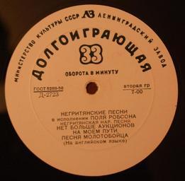 Keywords: Paul Robeson - Negro Songs - Soviet Ministry of Culture.JPG en Paul Robeson record Negro Songs published by Soviet Ministry of Culture in 1950's Original Record s 1940 Photographed 2012-06-26 self-photographed Jarekt Record Label PD-text Photograph Jarekt Paul Robeson Soviet Union in the 1950s Music of the Soviet Union Photographs by Jarek Tuszynski |