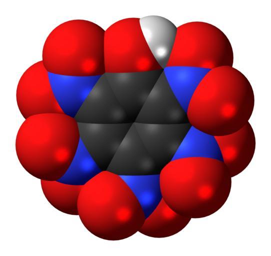 Keywords: Pentanitrophenol-3D-spacefill.png Space-filling model of the pentanitrophenol molecule a nitro compound Colour code 505050 Carbon C black<br> F0F0F0 Hydrogen H white<br> F51E1E Oxygen O red<br> 3C50FA Nitrogen N blue<br> 2011-01-27 own DS Visualizer Jynto talk Ball-and-stick version cc-zero Pentanitrophenol Images by Jynto |