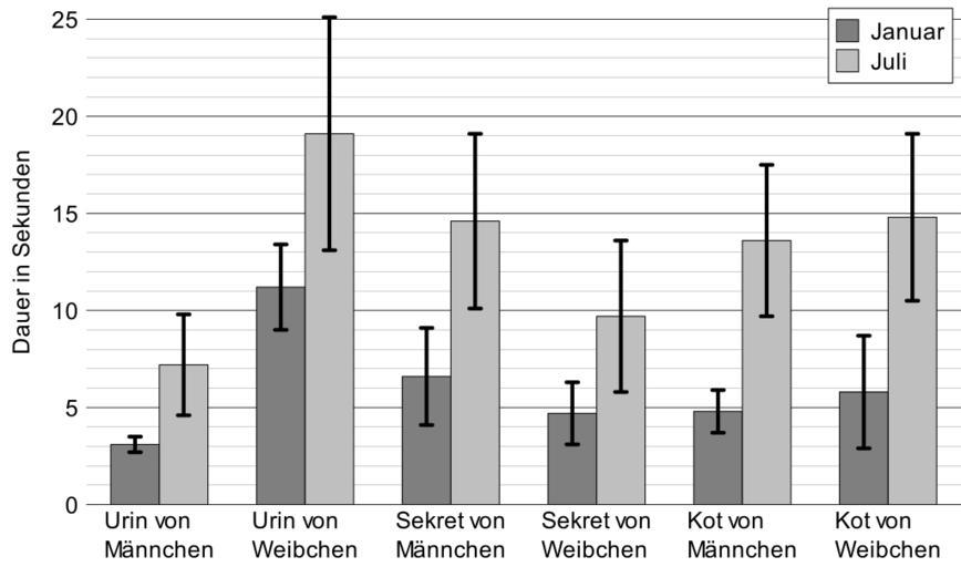 Keywords: Phodopus roborovskii DE Markierverhalten.svg Durchschnittliche Dauer in Sekunden die männliche Roborowski-Zwerghamster am Urin am Sekret der Bauchdrüse und am Kot männlicher und weiblicher Artgenossen schnuppern; mit Standardfehlern EN mean number of seconds spent sniffing by Phodopus roborovskii males exposed to urine mid-ventral gland secretion and feces from conspecific males and females; with standard errors selbst erstellt mit Gnumeric 1 7 EN own work / nach Natalja Jurjewna Feoktistowa Ilja Grigorjewitsch Meschtscherski Behavioral Responses of Dwarf Hamsters Phodopus roborovskii and Phodopus sungorus to Same-Sex and Opposite-Sex Odors in Different Seasons In Robert E Johnston Dietland Müller-Schwarze Peter W Sorensen Hrsg Advances in Chemical Signals in Vertebrates Kluwer Academic/Plenum Publishers 1999 ISBN 0-306-46114-5 S 431 “436 Englisch; Tab 2 3 2008-03-12 Torben Schink wikitable style text-align center; - rowspan 2 Datum 2 durchschn Tageslänge 3 Lufttemperatur 2 Urin 2 Sekret 2 Kot - niedrigste durchschn höchste Männchen Weibchen Männchen Weibchen Männchen Weibchen - 24 “31 Januar 8 h 15 min ˆ’9 0 °C ˆ’2 8 °C 0 0 °C 3 1 ±0 4 11 2 ±2 2 6 6 ±2 5 4 7 ±1 6 4 8 ±1 1 5 8 ±2 9 - 12 “20 Juli 16 h 50 min +6 0 °C +16 8 °C +30 0 °C 7 2 ±2 6 19 1 ±6 0 14 6 ±4 5 9 7 ±3 9 13 6 ±3 9 14 8 ±4 3 Die Angaben beziehen sich auf neun unter halbnatürlichen Bedingungen gehaltene männliche Roborowski-Zwerghamster Phodopus roborovskii |
