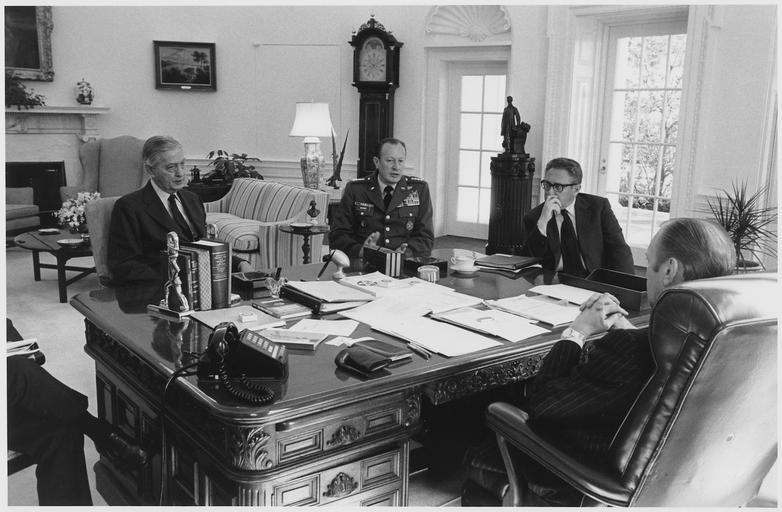 Keywords: Photograph of President Gerald Ford Meeting with Brent Scowcroft, Graham Martin, General Frederick Weyand, and Henry... - NARA - 186794.tif This photograph was taken in the Oval Office of the White House Pictured with President Ford are Brent Scowcroft Deputy Assistant to the President for National Security Affairs; Graham Martin United States Ambassador to the Republic of Vietnam; Army Chief of Staff General Frederick Weyand; and Secretary of State Henry A Kissinger Gerald Ford has his back to the camera Brent Scowcroft is partially obscured General notes 186794 Local identifier GRF-WHPO-3779 7 President 1974-1977 Ford White House Photographic Office 1974 - 1977 Kennerly David Hume 1947- Photographer 1312484 <br /> Institution Gerald R Ford Presidential Library Gerald R Ford Library NLGRF 1000 Beal Avenue Ann Arbor MI 48109-2114 1975-03-25 Record group Collection GRF-WHPO White House Photographic Office Collection Ford Administration 12/06/1973 - 01/20/1977 Record group ARC 1136 Gerald R Ford White House Photographs compiled 08/09/1974 - 01/20/1977 Series ARC 1756311 File unit File unit ARC Variant control numbers NAIL Control Number NLF-WHPO-A-A3779 7 yes Other versions Gerald R Ford Presidential Library and Museum-cooperation PD-USGov Gerald Ford in the Oval Office Wilson desk Meetings Graham Martin Frederick C Weyand Henry Kissinger Gerald Ford in 1975 Gerald R Ford Presidential Library and Museum series Gerald R Ford White House Photographs compiled 08/09/1974 - 01/20/1977 Art in the Oval Office |