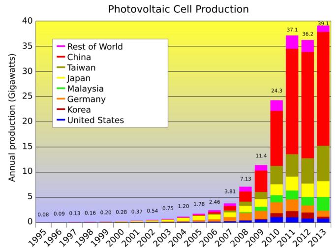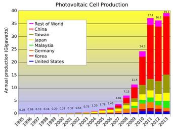 Keywords: Photovoltaics cell production.svg translate yes en Photovoltaic cell manufacturing production from 1995-2013 Data source is http //www iea-pvps org/fileadmin/dam/public/report/statistics/IEA_PVPS_Trends_2014_in_PV_Applications_-_lr pdf IEA-PVPS pg 44 and http //www earth-policy org/datacenter/xls/indicator12_2013_2 xlsx Earth Policy Institute 2014-11-12 own Delphi234 other versions Largest Producers of Solar Cells by Country-Market Share svg current annually cc-zero Uploaded with UploadWizard Photovoltaic power statistics |