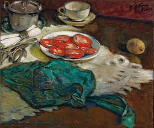 Keywords: Piotr Nilus Tomates coupées et tablier vert.jpg Tomates coupées et tablier vert serie blanche laut rückseitigem Etikett signiert bezeichnet P Nilouss Paris Öl auf Leinwand 45 7 x 55 cm http //www dorotheum com/ early other date s 1930 Creator Piotr Nilus PD-old-auto 1943 Images from Dorotheum Piotr Nilus 20th-century still-life paintings of fruits Tomatoes in art Tableware in art |