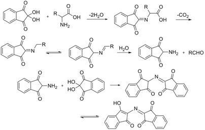Keywords: 茚三酮反应过程.png 茚三酮反应过程<br />Ninhydrin reaction mechanism Own 2008-01-28 puppy8800 Ninhydrin_Reaction_Mechanism svg Chemical reactions Ninhydrin