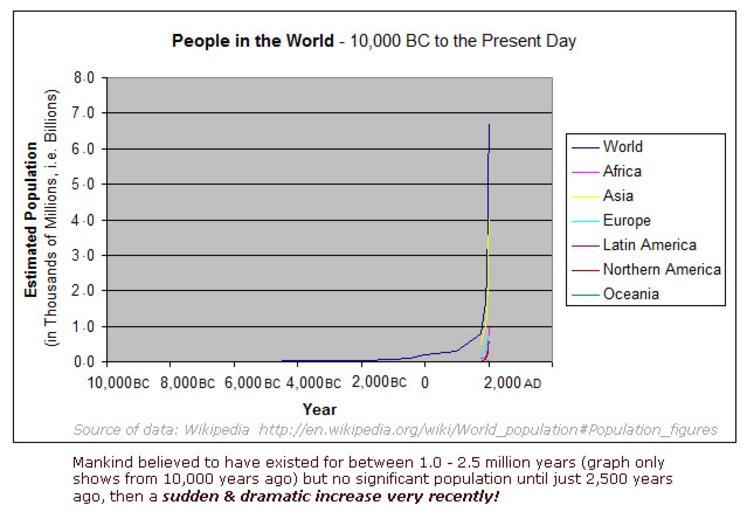 Keywords: Population-since-10000BC-.jpg Note a Minimal population for over 1 million years of human history only last 10 000 years shown on graph b Steady growth began around 500BC c Growth accelerated noticeably from around 1000AD onwards d yet faster growth from around 1800AD e Dramatic growth since 1950 to the present day with even more forecast Own work - chart developed based on data found on http //en wikipedia org/wiki/World_population Population_figures BS 2009-01-24 Temporal population graphs |