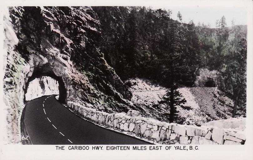 Keywords: outdoor photo border "The Cariboo Hwy. Eighteen Miles East of Yale, B. C." Made in Canada by the Gowen, Sutton Co. Ltd., Vancouver, B.C. Two tunnels on the old Fraser Canyon Highway (a.k.a. Cariboo Highway) at Tunnel Bluff. Original photo retouched to replace the gravel roadway with a modern, paved one. "The Cariboo Hwy. Eighteen Miles East of Yale, B. C." Made in Canada by the Gowen, Sutton Co. Ltd., Vancouver, B.C. Two tunnels on the old Fraser Canyon Highway (a.k.a. Cariboo Highway) at Tunnel Bluff. Original photo retouched to replace the gravel roadway with a modern, paved one. |