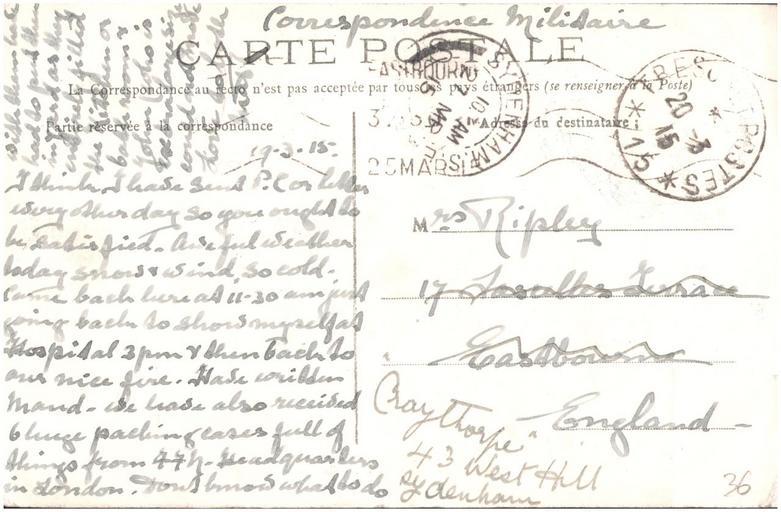 Keywords: postcard france dunkirk dunkerque 1915 war world war 1 worldwar1 ww1 public domain publicdomain nurse ripley nurseripley text writing document drawing sketch monochrome Sent by a nurse, Margaret Ripley, to her mother back in England. It's amusing to see that the last couple of cards were sent to the home address in Kenley and redirected to Eastbourne, and now this one has been addressed there and redirected back! As far as I can tell (corrections and additions welcome) this reads: "19.3.15 I think I have sent P.C. or letter every other day so you ought to be satisfied. Awful weather today snow & wind. So cold. Came back here at 11.30 am just going back to show myself at Hospital 3pm & then back to our nice fire. Have written Maud. We have also received 6 huge packing cases full of things from FFN [French Flag Nurses] Headquarters in London. Don't know what to do with them have had to put them in yard as they entirely filled the kitchen or bath room & John (who is extra large size could not move. Love to both Mar" For more details of the story behind this album see www.flickr.com/photos/whatsthatpicture/sets/7215762769463... Sent by a nurse, Margaret Ripley, to her mother back in England. It's amusing to see that the last couple of cards were sent to the home address in Kenley and redirected to Eastbourne, and now this one has been addressed there and redirected back! As far as I can tell (corrections and additions welcome) this reads: "19.3.15 I think I have sent P.C. or letter every other day so you ought to be satisfied. Awful weather today snow & wind. So cold. Came back here at 11.30 am just going back to show myself at Hospital 3pm & then back to our nice fire. Have written Maud. We have also received 6 huge packing cases full of things from FFN [French Flag Nurses] Headquarters in London. Don't know what to do with them have had to put them in yard as they entirely filled the kitchen or bath room & John (who is extra large size could not move. Love to both Mar" For more details of the story behind this album see www.flickr.com/photos/whatsthatpicture/sets/7215762769463... |
