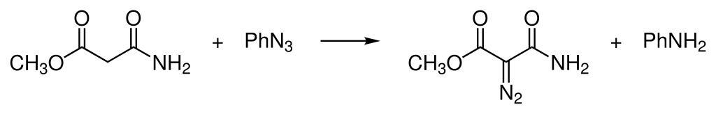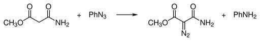 Keywords: Preparation of diazomalonic acid ester by Dimroth.svg Reaction scheme of methyl malonamate and phenyl azide giving 2-diazomalonamic acid methyl ester Own 2007-07-21 Calvero Chemical reactions Phenyl azide