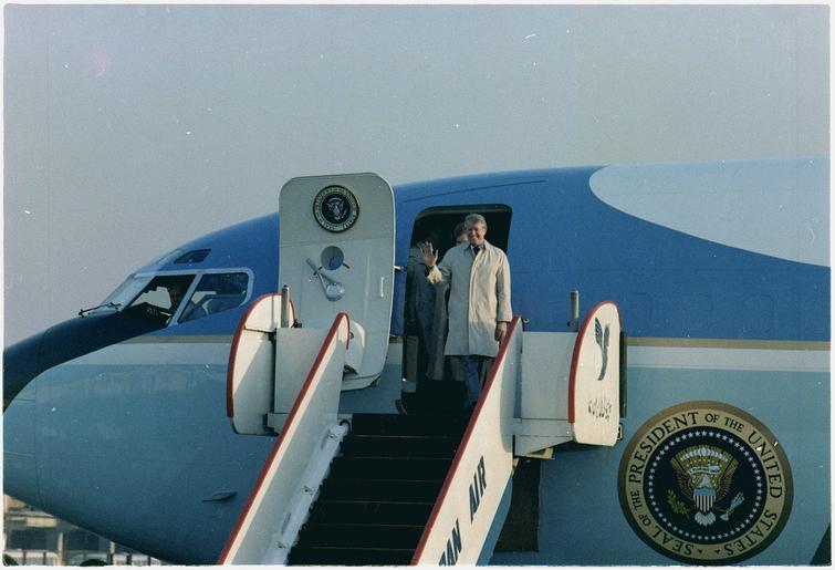 Keywords: President Carter waves from Air Force One on his arrival in Tehran, Iran. - NARA - 177328.tif Scope and content General notes 177328 Local identifier President 1977-1981 Carter White House Staff Photographers 01/20/1977 - 01/20/1981 Jimmy Carter Library NLJC 441 Freedom Parkway Atlanta GA 30307-1498 1977-12-31 Record group Collection JC-WHSP Carter White House Photographs Collection 01/20/1977 - 01/22/1981 Record group ARC 1120 Carter White House Photographs Presidential compiled 01/20/1977 - 01/22/1981 Series ARC 173341 File unit President and Mrs Carter's trip -- Tehran Iran 12/31/1977 - 12/31/1977 File unit ARC 177327 Variant control numbers NAIL Control Number NLC-WHSP-C-03785-19A yes Other versions NARA-cooperation PD-USGov Jimmy Carter Presidents of the United States in foreign countries Boeing VC-137C Tehran in the 1970s |