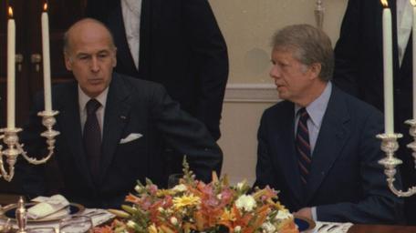 Keywords: President Giscard d'Estaing of France and Jimmy Carter participate in a working dinner. - NARA - 179591 (cropped).tiff Scope and content General notes 179591 Local identifier President 1977-1981 Carter White House Staff Photographers 01/20/1977 - 01/20/1981 Jimmy Carter Library NLJC 441 Freedom Parkway Atlanta GA 30307-1498 1978-05-26 Record group Collection JC-WHSP Carter White House Photographs Collection 01/20/1977 - 01/22/1981 Record group ARC 1120 Carter White House Photographs Presidential compiled 01/20/1977 - 01/22/1981 Series ARC 173341 File unit Working dinner for President G D'Estaing of France 05/26/1978 - 05/26/1978 File unit ARC 179590 Variant control numbers NAIL Control Number NLC-WHSP-C-05872-20 yes Other versions extract from File President Giscard d'Estaing of France and Jimmy Carter participate in a working dinner - NARA - 179591 tif Atelier graphique PD-USGov Uploaded with UploadWizard Jimmy Carter and Valéry Giscard d'Estaing |