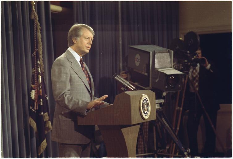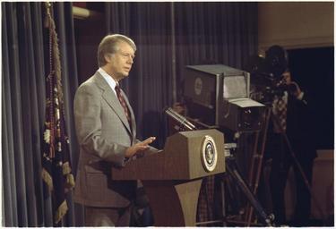 Keywords: President Jimmy Carter, first press conference - NARA - 173605.tif Scope and content General notes 173605 Local identifier President 1977-1981 Carter White House Staff Photographers 01/20/1977 - 01/20/1981 Jimmy Carter Library NLJC 441 Freedom Parkway Atlanta GA 30307-1498 1977-02-08 Record group Collection JC-WHSP Carter White House Photographs Collection 01/20/1977 - 01/22/1981 Record group ARC 1120 Carter White House Photographs Presidential compiled 01/20/1977 - 01/22/1981 Series ARC 173341 File unit First Press Conference 02/08/1977 - 02/08/1977 File unit ARC 173604 Variant control numbers NAIL Control Number NLC-WHSP-C-00248-8 yes Other versions NARA-cooperation PD-USGov Press conferences in the White House Jimmy Carter |