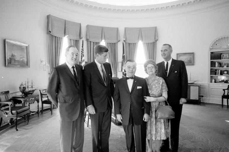 Keywords: u.s. national archives usnationalarchives jfk presidential library jfkpresidentiallibrary blackandwhite people monochrome black and white Original Caption: President John F. Kennedy with Vice President Lyndon B. Johnson, Senator Hubert Humphrey (Minnesota), and Guests We are looking for your help in identifying unknown people in our White House Photographs collection. If you have any information about this photograph, please post a comment, including any relevant sources, for the catalogers at the John F. Kennedy Presidential Library. Thank you! Local Identifier: JFKWHP-ST-49-1-62 Created By: President (1961-1963 : Kennedy). Office of the Naval Aide to the President. (1961 - 1963) From: President (1963-1969 : Johnson). White House Photograph Office. (1963 - 1969) Contact: John F. Kennedy Library (LP-JFK), Columbia Point Boston, MA 02125-3398 Phone: 617-514-1600 Fax: 617-514-1652 Email: kennedy.library@nara.gov Production Dates: 2/6/1962 Scope and Content Note: In this photograph President John F. Kennedy visits with Vice President Lyndon B. Johnson (right), Senator Hubert H. Humphrey, Jr. of Minnesota (left), and two unidentified guests in the Oval Office, White House, Washington, D.C. Persistent URL: JFK Library URL: www.jfklibrary.org/Asset-Viewer/Archives/JFKWHP-ST-49-1-6... Access Restrictions: Unrestricted Use Restrictions: Unrestricted Original Caption: President John F. Kennedy with Vice President Lyndon B. Johnson, Senator Hubert Humphrey (Minnesota), and Guests We are looking for your help in identifying unknown people in our White House Photographs collection. If you have any information about this photograph, please post a comment, including any relevant sources, for the catalogers at the John F. Kennedy Presidential Library. Thank you! Local Identifier: JFKWHP-ST-49-1-62 Created By: President (1961-1963 : Kennedy). Office of the Naval Aide to the President. (1961 - 1963) From: President (1963-1969 : Johnson). White House Photograph Office. (1963 - 1969) Contact: John F. Kennedy Library (LP-JFK), Columbia Point Boston, MA 02125-3398 Phone: 617-514-1600 Fax: 617-514-1652 Email: kennedy.library@nara.gov Production Dates: 2/6/1962 Scope and Content Note: In this photograph President John F. Kennedy visits with Vice President Lyndon B. Johnson (right), Senator Hubert H. Humphrey, Jr. of Minnesota (left), and two unidentified guests in the Oval Office, White House, Washington, D.C. Persistent URL: JFK Library URL: www.jfklibrary.org/Asset-Viewer/Archives/JFKWHP-ST-49-1-6... Access Restrictions: Unrestricted Use Restrictions: Unrestricted |