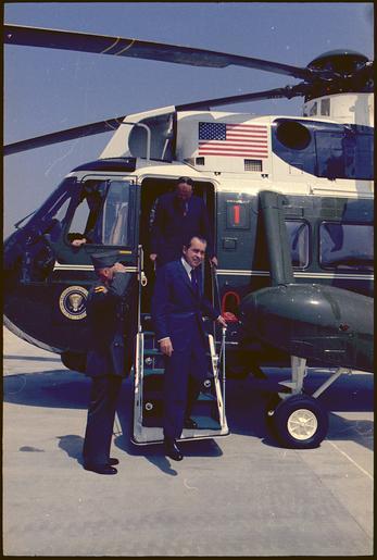 Keywords: President Nixon and John D. Ehrlichman deplaning from "Marine One" - NARA - 194354.tif Scope and content Pictured John Ehrlichman Richard M Nixon Subject Helicopters General notes 194354 Local identifier NLRN-WHPO-C5956-23A General Services Administration National Archives and Records Service Office of Presidential Libraries Office of Presidential Papers 01/20/1969 - ca 12/1974 Most Recent <br /> President 1969-1974 Nixon White House Photo Office 1969 - 1974 Most Recent NARA-Author Atkins Oliver F 1916-1977 Photographer 8451334 <br /> Richard Nixon Library NLRN 18001 Yorba Linda Boulevard Yorba Linda CA 92886 1971-03-31 Record group Collection RN-WHPO White House Photo Office Collection Nixon Administration 01/20/1969 - 08/09/1974 Record group ARC 1179 Nixon White House Photographs compiled 01/20/1969 - 08/09/1974 documenting the period 08/08/1968 - 08/09/1974 Series ARC 194277 File unit File unit ARC Variant control numbers NAIL Control Number NLNP-WHPO-MPF-C5956 23A yes Other versions NARA-cooperation PD-USGov Richard Nixon Richard Nixon and Marine One John Ehrlichman 1971 Photographs by Ollie Atkins Marine One |
