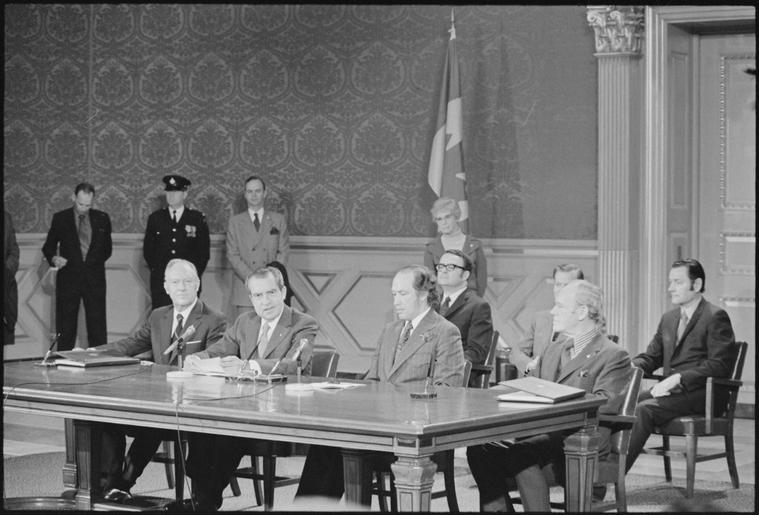 Keywords: President Nixon and Prime Minister Trudeau at the signing ceremony for the Great Lakes Water Quality Agreement - NARA - 194763.tif Scope and content Pictured William P Rogers Richard M Nixon Pierre Trudeau Subject Heads of State - Canada General notes 194763 Local identifier NLRN-WHPO-8893-22 General Services Administration National Archives and Records Service Office of Presidential Libraries Office of Presidential Papers 01/20/1969 - ca 12/1974 Most Recent <br /> President 1969-1974 Nixon White House Photo Office 1969 - 1974 Most Recent NARA-Author Schumaker Byron E ca 1935- Photographer 8451340 <br /> Richard Nixon Library NLRN 18001 Yorba Linda Boulevard Yorba Linda CA 92886 1972-04-15 Record group Collection RN-WHPO White House Photo Office Collection Nixon Administration 01/20/1969 - 08/09/1974 Record group ARC 1179 Nixon White House Photographs compiled 01/20/1969 - 08/09/1974 documenting the period 08/08/1968 - 08/09/1974 Series ARC 194277 File unit File unit ARC Variant control numbers NAIL Control Number NLNP-WHPO-MPF-8893 22 yes Other versions NARA-cooperation PD-USGov Richard Nixon with national leaders |