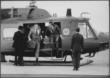 Keywords: President Nixon and unidentified aide disembarking from a helicopter - NARA - 194573.tif Scope and content Pictured Richard M Nixon Subject Helicopters General notes 194573 Local identifier NLRN-WHPO-E2360-06 General Services Administration National Archives and Records Service Office of Presidential Libraries Office of Presidential Papers 01/20/1969 - ca 12/1974 Most Recent <br /> President 1969-1974 Nixon White House Photo Office 1969 - 1974 Most Recent NARA-Author Knudsen Robert L Robert LeRoy 1929-1989 Photographer 8451337 <br /> Richard Nixon Library NLRN 18001 Yorba Linda Boulevard Yorba Linda CA 92886 Record group Collection RN-WHPO White House Photo Office Collection Nixon Administration 01/20/1969 - 08/09/1974 Record group ARC 1179 Nixon White House Photographs compiled 01/20/1969 - 08/09/1974 documenting the period 08/08/1968 - 08/09/1974 Series ARC 194277 File unit File unit ARC Variant control numbers NAIL Control Number NLNP-WHPO-MPF-E2360 06 yes Other versions NARA-cooperation PD-USGov Richard Nixon and Marine One Bell UH-1 Iroquois |
