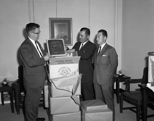 Keywords: u.s. national archives usnationalarchives jfk presidential library jfkpresidentiallibrary blackandwhite monochrome indoor black and white Original Caption: Presidential Assistant John J. McNally with Japanese Visitors and Gifts We are looking for your help in identifying unknown people in our White House Photographs collection. If you have any information about this photograph, please post a comment, including any relevant sources, for the catalogers at the John F. Kennedy Presidential Library. Thank you! Local Identifier: JFKWHP-KN-18078 Created By: President (1961-1963 : Kennedy). Office of the Naval Aide to the President.(1961 - 1963) From: Collection JFK-WHP: White House Photographs, 12/19/1960 - 03/11/1964 Contact: John F. Kennedy Library (LP-JFK), Columbia Point Boston, MA 02125-3398 Phone: 617-514-1600 Fax: 617-514-1652 Email: kennedy.library@nara.gov Production Dates: 6/19/1961 Scope and Content Note: This is a photograph of a delivery of gifts for President John F. Kennedy. Presidential Assistant John J. “Jack” McNally (on the left) and two unidentified Japanese men and a plaque with an engraving of President Kennedy, White House, Washington, D.C. Persistent URL: JFK Library URL: www.jfklibrary.org/Asset-Viewer/Archives/JFKWHP-KN-18078.... Access Restrictions: Unrestricted Use Restrictions: Unrestricted Original Caption: Presidential Assistant John J. McNally with Japanese Visitors and Gifts We are looking for your help in identifying unknown people in our White House Photographs collection. If you have any information about this photograph, please post a comment, including any relevant sources, for the catalogers at the John F. Kennedy Presidential Library. Thank you! Local Identifier: JFKWHP-KN-18078 Created By: President (1961-1963 : Kennedy). Office of the Naval Aide to the President.(1961 - 1963) From: Collection JFK-WHP: White House Photographs, 12/19/1960 - 03/11/1964 Contact: John F. Kennedy Library (LP-JFK), Columbia Point Boston, MA 02125-3398 Phone: 617-514-1600 Fax: 617-514-1652 Email: kennedy.library@nara.gov Production Dates: 6/19/1961 Scope and Content Note: This is a photograph of a delivery of gifts for President John F. Kennedy. Presidential Assistant John J. “Jack” McNally (on the left) and two unidentified Japanese men and a plaque with an engraving of President Kennedy, White House, Washington, D.C. Persistent URL: JFK Library URL: www.jfklibrary.org/Asset-Viewer/Archives/JFKWHP-KN-18078.... Access Restrictions: Unrestricted Use Restrictions: Unrestricted |