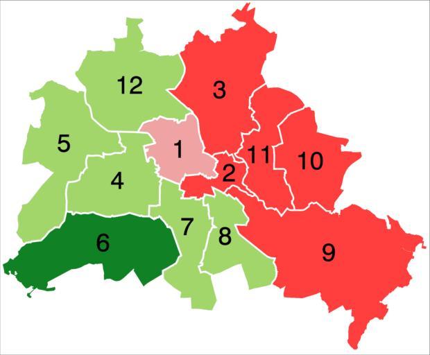 Keywords: Pro Reli.png de Ergebnisse des Berliner Volksentscheids Pro Reli am 27 April 2009 nach Bezirken Quelle der Daten http //www wahlen-berlin de/wahlen/Volksentscheid-2009-ProReli/ergebnisse/ve09-proz asp Dunkelgrün über 60 Ja-Stimmen der Teilnehmer und über 25 der Stimmberechtigten Hellgrün über 60 Ja-Stimmen der Teilnehmer und unter 25 der Stimmberechtigten Hellrot über 50 Nein-Stimmen der Teilnehmer und unter 25 der Stimmberechtigten Rot über 70 Nein-Stimmen der Teilnehmer und unter 25 der Stimmberechtigten File Berliner Bezirke 2001 png 2009-04-27 User Friedrichstrasse map and Chin tin tin coloured wikitable sortable style text-align left - class hintergrundfarbe6 +Vorläufiges amtliches Endergebnis nach Angaben des Landeswahlleiters Berlin - style background DDFFDD; Nr Region Wahlbeteiligung Ja Wähler Ja Stimmberechtigte Nein Wähler Ungültig Wähler - style background FFDDDD; 1 Mitte 24 3 44 8 10 9 55 0 0 2 - style background FFDDDD; 2 Friedrichshain-Kreuzberg 26 2 27 1 7 1 72 7 0 2 - style background FFDDDD; 3 Pankow 27 9 28 9 8 1 70 9 0 2 - style background FFDDDD; 4 Charlottenburg-Wilmersdorf 33 8 60 4 20 4 39 4 0 2 - style background FFDDDD; 5 Spandau 28 1 69 2 19 4 30 7 0 2 - style background FFDDDD; 6 Steglitz-Zehlendorf 41 4 66 3 27 7 33 5 0 2 - style background FFDDDD; 7 Tempelhof-Schöneberg 33 6 60 9 20 5 38 9 0 2 - style background FFDDDD; 8 Neukölln 26 5 61 8 16 4 37 9 0 3 - style background FFDDDD; 9 Treptow-Köpenick 27 7 26 3 7 3 73 5 0 2 - style background FFDDDD; 10 Marzahn-Hellersdorf 21 6 22 7 4 9 77 0 0 3 - style background FFDDDD; 11 Lichtenberg 23 2 21 3 5 0 78 4 0 3 - style background FFDDDD; 12 Reinickendorf 33 2 69 1 22 9 30 7 0 2 - style background FFDDDD; Berlin insgesamt 29 2 48 5 14 2 51 3 0 2 <br clear both /> checked Maps of Berlin |