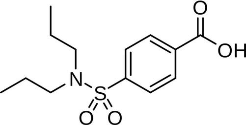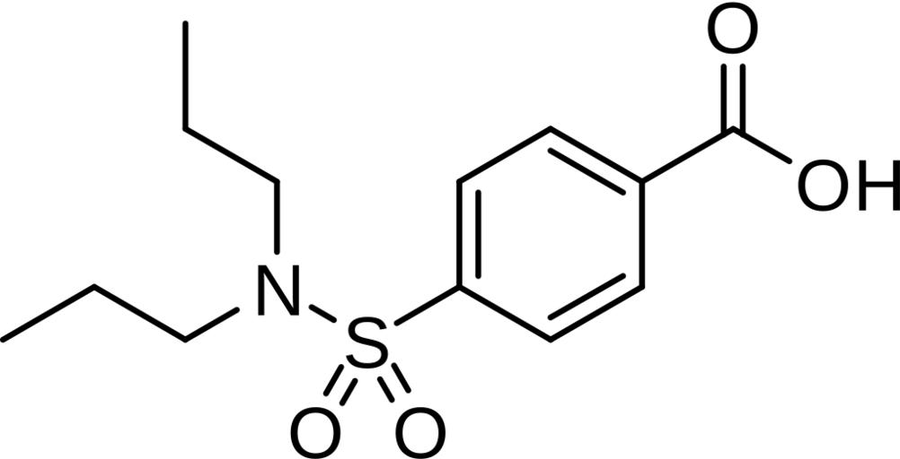 Keywords: Probenecid.svg en 2D-structure of probenecid Benuryl own Harbinary 2009-11-31 Antigout agents