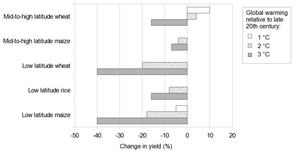 Keywords: Projected changes in crop yields at different latitudes with global warming.png crop yields at different latitudes with global warming Projected changes are shown for 1-3 °C of global warming relative to late 20th century For mid-to-high latitudes changes in yield are shown for wheat and maize For low-latitudes changes are shown for wheat rice and maize In mid-to-high latitudes wheat yields increase for warming of 1-2 °C Yields decrease at 3 °C maize yields are unchanged for 1 °C of warming Yields decrease at 2-3 °C In low latitudes wheat and rice yields are unchanged at 1 °C They decrease at 2-3 °C maize yields decrease at 1-3 °C Data Values are approximate and are taken from the US National Research Council US NRC 2011 <ref name figure 5 1 > http //www nap edu/openbook php record_id 12877 page 161 Figure 5 1 p 161 in harvnb US NRC 2011 </ref> The first second and third numbers are the projected changes in yields for 1 2 and 3 °C of global warming respectively Mid-to-high latitude wheat +10 +4 -16 Mid-to-high latitude maize 0 -4 -7 Low latitude wheat 0 -20 -40 Low latitude rice 0 -8 -16 Low latitude maize -5 -18 -40 US NRC 2011 <ref name figure 5 1 /> drew on several studies The graph does not show the likely ranges included in US NRC 2011 <ref name figure 5 1 /> The likely range means that there is a 67 chance of the projected change in yield being correct based on expert judgement <ref name figure 5 1 /> For 1 °C of global warming the likely range is roughly equal to plus or minus +/- 10 for all projected changes in yields Uncertainty increases with temperature For 3 °C of warming the likely range is roughly +/- 10 for mid-to-high latitude wheat mid-to-high latitude maize and low-latitude rice; +/- 20 for low-latitude wheat and low-latitude maize These projections broadly show the probable changes in regional yields <ref name us nrc text > http //www nap edu/openbook php record_id 12877 page 160 pp 160-162 in US NRC 2011 </ref> The projections do not include measures to adapt to global warming <ref name us nrc text /> Actual changes in yields may vary according to local conditions <ref name us nrc text /> There are numerous other uncertainties including how local climate will change with global warming and the atmospheric concentration of carbon dioxide CO<sub>2</sub> associated with different magnitudes of global warming <ref name us nrc text /> There is also the possibility that yields will change if critical thresholds are crossed <ref name us nrc text /> Many of the uncertainties could bias the projections towards underestimating reductions in crop yields <ref name us nrc text /> However adaptation practices could help to reduce losses in yields <ref name us nrc text /> Adaptation will be more difficult for higher magnitudes of warming and may be less effective in tropical regions <ref name us nrc text /> Notes reflist References citation CITEREFUS NRC2011 US NRC 2011 Climate Stabilization Targets Emissions Concentrations and Impacts over Decades to Millennia Sec 5 1 FOOD PRODUCTION PRICES AND HUNGER in Ch 5 Impacts in the Next Few Decades and Coming Centuries http //www nap edu/openbook php record_id 12877 page 159 http //www nap edu/catalog php record_id 12877 National Academies Press Washington D C USA own Enescot 2013-07-14 Comma-separated values Data were exported from OpenOffice org 3 4 1 Calc as comma-separated values csv The following options were used Character set Western Europe 1252 Field delimiter Text delimiter Quote all text cells no Save cell content as shown yes Fixed column width no <pre> Global warming relative to late 20th century Region and crop 1 2 3 Mid-to-high latitude wheat 10 4 -16 Changes in yield Mid-to-high latitude maize 0 -4 -7 Low latitude wheat 0 -20 -40 Low latitude rice 0 -8 -16 Low latitude maize -5 -18 -40 </pre> Global warming graphs Agriculture Cc-zero |