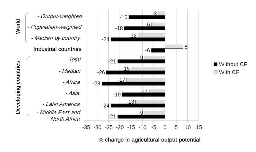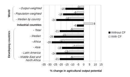 Keywords: Projected effect of climate change on agricultural productivity for different regions (Cline, 2007).png climate change on agricultural productivity for different regions The graph shows changes in productivity with and without the potential benefits of increased carbon fertilization CF see en Ocean fertilization The projection is for the time period 2070 to 2099 the 2080s and assumes that no efforts are made to reduce human greenhouse gas GHG emissions In the year 2085 the scenario projects atmospheric carbon dioxide CO<sub>2</sub> concentration of 735 parts per million Global warming of 3 °C compared to pre-industrial times is projected in the 2080s with 5 °C average warming over land areas and 4 4 °C by farm area The projection suggests that climate change will reduce global agricultural productivity The largest reductions are projected in developing countries A table of the graph data is included in a later section References citation March 2008 Global Warming and Agriculture Cline W R Finance and Development International Monetary Fund 45 1 http //www imf org/external/pubs/ft/fandd/2008/03/cline htm Archived https //web archive org/web/20140817114644/http //www imf org/external/pubs/ft/fandd/2008/03/cline htm 17 August 2014 More detailed data are available from citation Projected impact of climate change on agricultural yields European Environment Agency EEA http //www eea europa eu/data-and-maps/figures/projected-impact-of-climate-change/trend09-1m-soer2010-xls/at_download/file Archived https //web archive org/web/20140912090800/http //www eea europa eu/data-and-maps/figures/projected-impact-of-climate-change/trend09-1m-soer2010-xls/at_download/file 12 September 2014 Data http //www eea europa eu/data-and-maps/figures/projected-impact-of-climate-change tab-european-data webpage archived https //web archive org/web/20140912090800/http //www eea europa eu/data-and-maps/figures/projected-impact-of-climate-change 12 September 2014 2014-09-25 09 03 31 own Enescot other versions Data wikitable - Region Without CF With CF - World - Output-weighted -16 -3 - - Population-weighted -18 -6 - - Median by country -24 -12 - Industrial countries - Total -6 8 - Developing countries - Total -21 -9 - - Median -26 -15 - - Africa -28 -17 - - Asia -19 -7 - - Middle East and North Africa -21 -9 - - Latin America -24 -13 cc-zero Uploaded with UploadWizard Global warming graphs |