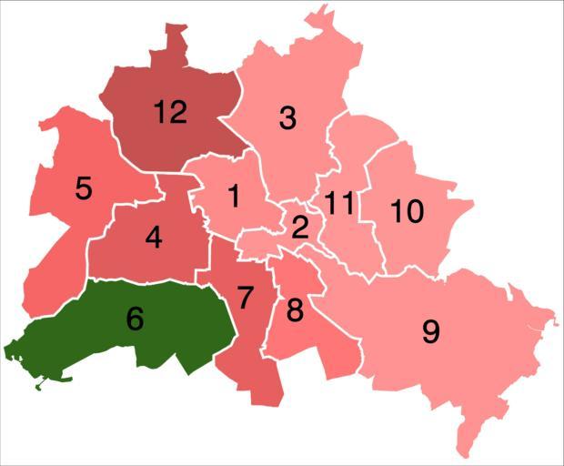 Keywords: Proreliabstufungenstimmberechtigtejawaehlerfarbe2.png de Anteil der Befürworter der Teilnehmern am Berliner Volksentscheid Pro Reli am 27 April 2009 nach Bezirken Quelle der Daten http //www wahlen-berlin de/wahlen/Volksentscheid-2009-ProReli/ergebnisse/ve09-proz asp dunkel 27 4 Ja-Stimmen der Stimmberechtigten Steglitz-Zehlendorf 6 bis hell 4 9 Ja-Stimmen der Stimmberechtigten Marzahn-Hellersdorf 10 Grün über 25 Ja-Stimmen der Stimmberechtigten und über 50 der Teilnehmer Rot unter 25 Ja-Stimmen der Stimmberechtigten File Berliner Bezirke 2001 png 2009-04-27 User Friedrichstrasse map and Chin tin tin coloured File Proreliabstufungenstimmberechtigtejawaehler png File Proreliabstufungenstimmberechtigtejawaehlerfarbe png File Proreliabstufungenstimmberechtigtejawaehlerfarbe3 png File Pro Reli png wikitable sortable style text-align left - class hintergrundfarbe6 +Vorläufiges amtliches Endergebnis nach Angaben des Landeswahlleiters Berlin - style background DDFFDD; Nr Region Wahlbeteiligung Ja Wähler Ja Stimmberechtigte Nein Wähler Ungültig Wähler - style background FFDDDD; 1 Mitte 24 3 44 8 10 9 55 0 0 2 - style background FFDDDD; 2 Friedrichshain-Kreuzberg 26 2 27 1 7 1 72 7 0 2 - style background FFDDDD; 3 Pankow 27 9 28 9 8 1 70 9 0 2 - style background FFDDDD; 4 Charlottenburg-Wilmersdorf 33 8 60 4 20 4 39 4 0 2 - style background FFDDDD; 5 Spandau 28 1 69 2 19 4 30 7 0 2 - style background FFDDDD; 6 Steglitz-Zehlendorf 41 4 66 3 27 7 33 5 0 2 - style background FFDDDD; 7 Tempelhof-Schöneberg 33 6 60 9 20 5 38 9 0 2 - style background FFDDDD; 8 Neukölln 26 5 61 8 16 4 37 9 0 3 - style background FFDDDD; 9 Treptow-Köpenick 27 7 26 3 7 3 73 5 0 2 - style background FFDDDD; 10 Marzahn-Hellersdorf 21 6 22 7 4 9 77 0 0 3 - style background FFDDDD; 11 Lichtenberg 23 2 21 3 5 0 78 4 0 3 - style background FFDDDD; 12 Reinickendorf 33 2 69 1 22 9 30 7 0 2 - style background FFDDDD; Berlin insgesamt 29 2 48 5 14 2 51 3 0 2 Maps of Berlin |