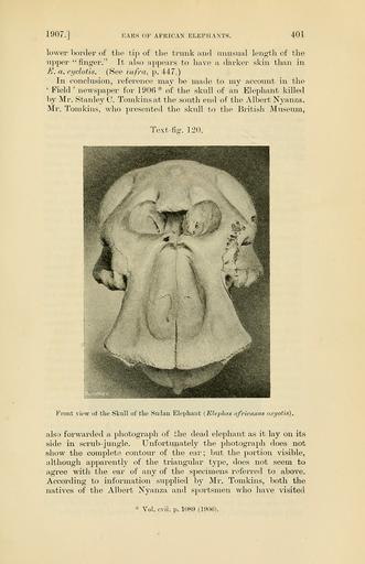 Keywords: PZSL1907Page401.png Elephas africanus oxyotis Loxodonta africana <small> Blumenbach 1797 </small> en Skull of adult African Bush Elephant shot by A Haig in northeastern Africa and presented to Natural History Museum from frontal Proceedings of the Zoological Society of London http //archive org/details/proceedingsofzoo19071446zool vol 1907 issue 2 http //archive org/stream/proceedingsofzoo19071446zool page/401/mode/1up page 401 1907 Butterworth PD-old PZSL1907Page401 extracted png PZSL 1907-2 |