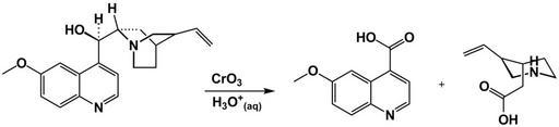 Keywords: QuinineOxidation.png en Oxidation of quinine by chromic acid to quininic acid and meroquinene de Oxidierung des Chinin durch Chromsäure zu Chininsäure und Merochinen Oxydation de la quinine par l'acide chromique en acide quinique et méroquinène own Spiperon 2008-07-19 Organic reactions Alkaloids Pharmacochemistry |